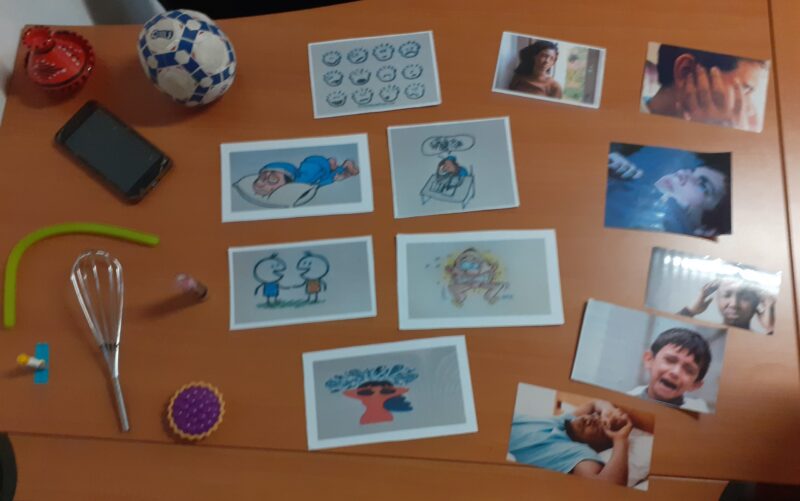 Auprès des partenaires, dans les lieux d’hébergement ou de formation, les salariées d’ECLAT animent également des séances de psychoéducation en petits groupes centrées sur les symptômes envahissants du Trouble de Stress Post-Traumatique. Elles utilisent des techniques d’expression basées sur des objets ou illustrées de pictogrammes, ce qui permet d’accueillir un large public, dont des personnes analphabètes.